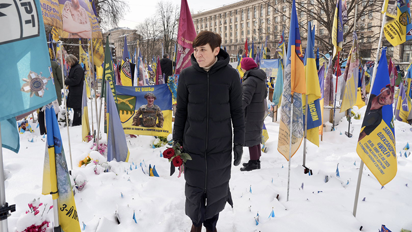 The Foreign Affairs and Defence Committee honours fallen soldiers at Maidan Square in Kyiv. Here is the Committee’s Chair, Ine Eriksen Søreide. Photo: Norwegian Embassy in Ukraine.
