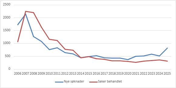 Figur 2.1 Søknader mottatt og behandlet av utvalget i perioden 2005–2025