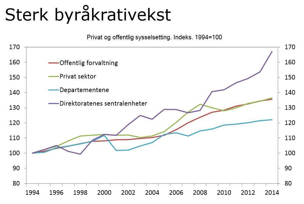 En viktig og underkommunisert årsak til veksten i offentlig sektor er at staten i stort omfang tiltar seg oppgaver hvor det eksisterer et velfungerende marked og sterke, etablerte fagmiljøer utenfor staten. Statliggjøringen av oppgaveløsningen skjer gjennom nye programmer og prosjekter, og delvis insourcing av oppgaver, hvor markedet tidligere har løst oppgaven. Hver for seg kan disse oppgavene virke tilforlatelige, men summen utgjør etter forslagsstillernes syn et økende problem, spesielt fordi det ikke er satt inn i en helhetlig sammenheng.