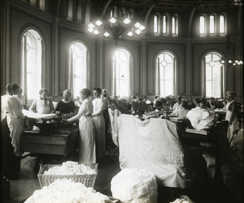 I 1916 kom en ny henvendelse fra Marie Qvale og sanitetskvinnene. De ønsket å låne lokaler i stortingsbygningen for å gjenoppta sitt frivillige arbeid for Hærens sanitet. Foto: Stortingsarkivet.