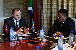 Stortingspresident Olemic Thommessen i samtale med sin motpart i parlamentet, speaker Max Sisulu. Foto: Hetty Zantman.