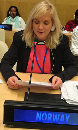 Gunvor Eldegard tok opp likestilling og jenters rett til skole under høringen i FN: Foto: Stortinget.