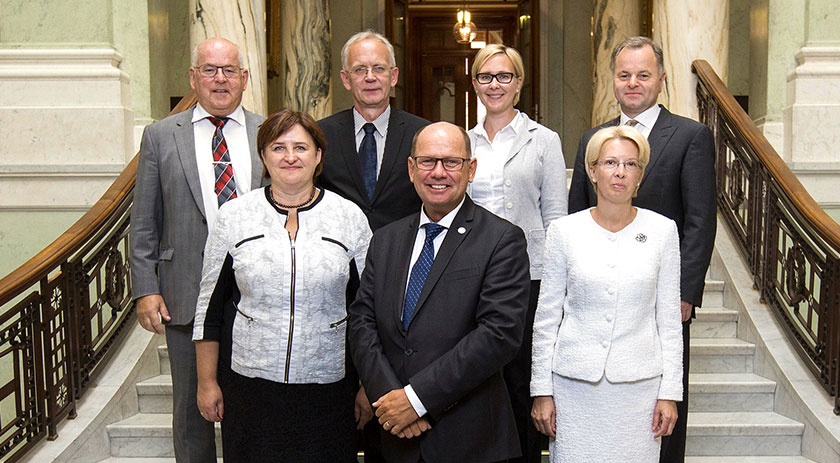 Nordiske og baltiske parlamentspresidenter. Fra venstre: Kristjan L. Möller, Island; Eiki Nestor, Estland; Maria Lohela, Finland; Olemic Thommessen, Norge; Loreta Graužinienė, Litauen; Urban Ahlin, Sverige; Ināra Mūrniece, Lativa. Foto: Melker Dahlstrand.