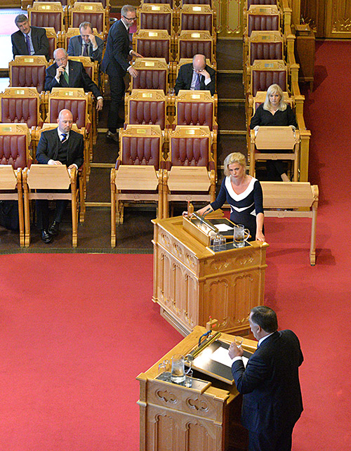 Jette F. Christensen (A) og Helge Thorheim (FrP) under debatten om utsendelse av lengeværende asylbarn og justis- og beredskapsministerens opplysningsplikt etter Grunnloven § 82. Foto: Stortinget.
