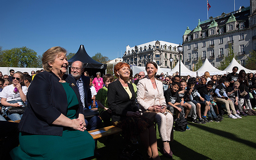 Stortingspresidenten, statsministeren, Erik Solbakken og flere hundre skoleelever deltok da stortingsbygningens 150-årsjubileum ble feiret i strålende solskinn 9. mai 2016.