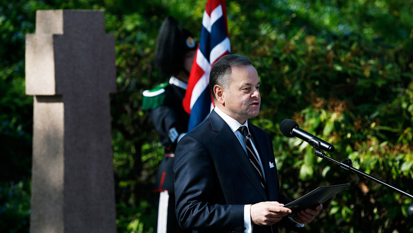 Stortingspresident Olemic Thommessen holdt 8. mai 2016 en tale og la ned en krans på rettestedet på Akerhus festning i anledning markeringen av frigjøringsdagen.