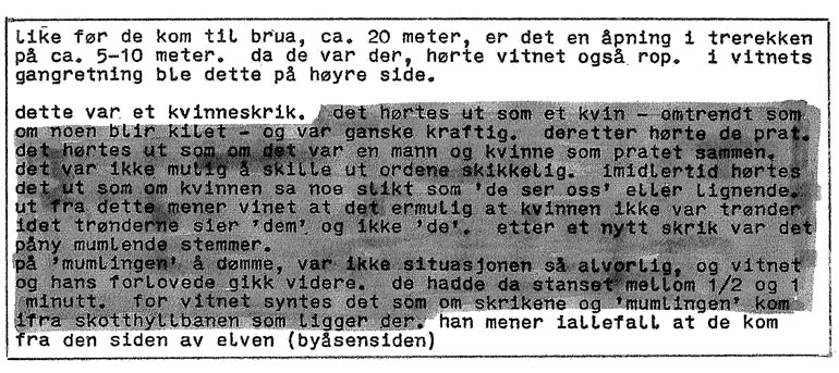 "...Anmeldelsen gjelder konkret vår bemerkning i avsnitt 116 i kjennelsen, som er foranlediget av avsnitt 115, som delvis gjengir vitnet As politiforklaring av 5. oktober 1977. I forklaringen sier han øverst på side 2 at han hørte rop. "I vitnets gangretning ble dette på høyre side". I det som ble gjengitt i forklaringen, heter det til slutt at det for ham syntes "som om skrikene og 'mumlingen' kom fra skotthyllbanen som ligger der".