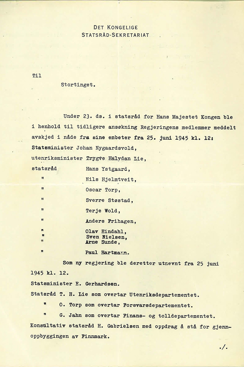 Samlingsregjeringen var bredt sammensatt, som vi ser av kunngjøringen til Stortinget, datert 26. juni 1945. Foto: Stortinget.