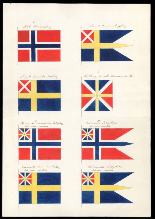 Flaggplansje fra 1899 som viser de norske og svenske flaggene som var i bruk. Det svenske handelsflagget hadde med unionsmerket, «sildesalaten», mens det norske handelsflagget var rent. Statsflagget skulle fortsatt ha unionsmerket, både i Sverige og i Norge. Fra Sirkulære av 18. oktober 1899. Foto: Stortingsarkivet.