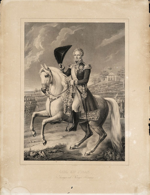 Kong Carl Johan til hest med tropper i bakgrunnen. Litografi etter Fredric Westin. Foto: Oslo Museum.