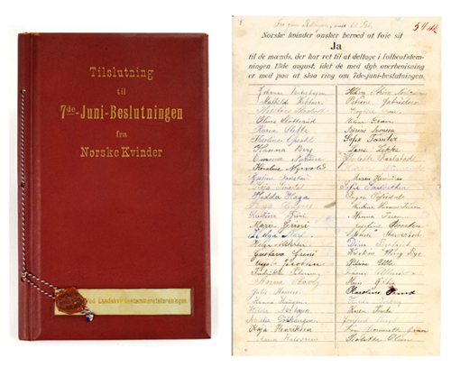 Bare tre dager etter at folkeavstemningen var avholdt mottok Stortinget en adresse fra Drammens Kvinderaad og en pakke med over 12 000 underskrifter til støtte for unionsoppløsningen. Noen dager senere overleverte LKSF sin adresse (bildet over), sammen med 4275 lister med 244 765 navn. Senere på høsten ble antallet supplert med ytterligere 35 113 navn. Stortingsarkivet.