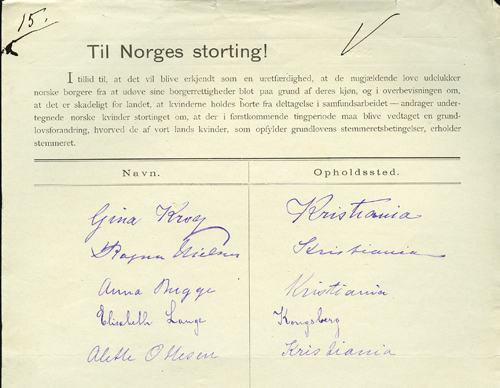 Før Stortinget behandlet grunnlovsforslaget om stemmerett for kvinner første gang i 1890, ble det samlet inn mange tusen underskrifter til støtte for forslaget. Gina Krog både fremmet forslaget og ledet kampanjen. Se egen nettpresentasjon. Stortingsarkivet.