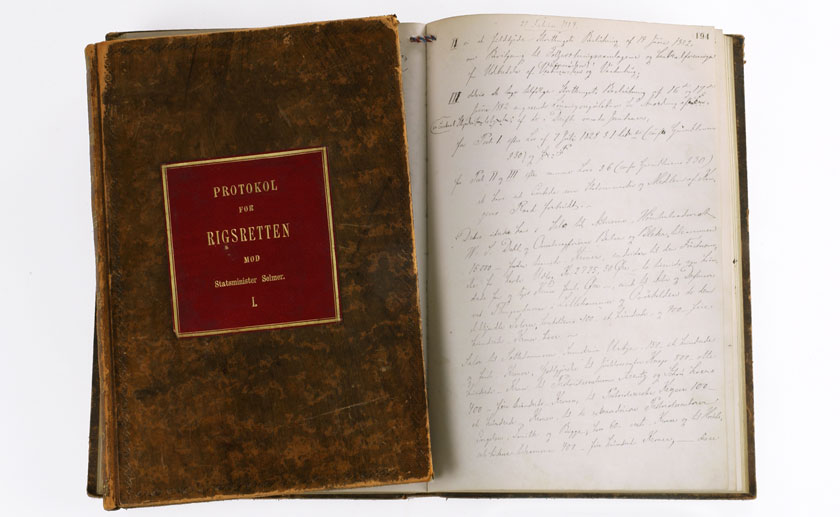 Protokoller fra riksrettssaken mot statsminister Selmer i 1883-84. Stortingsarkivet.