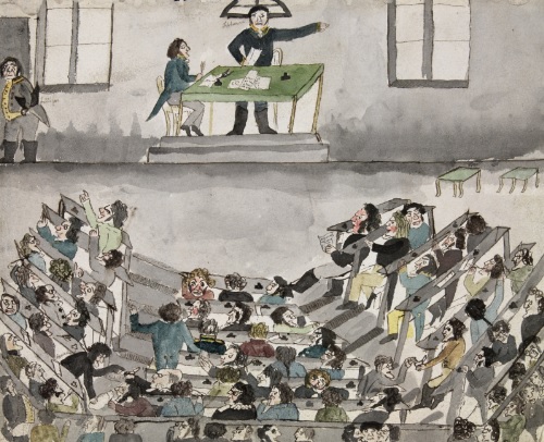 Henrik Wergelands tegning fra stortingsmøtet 10. februar 1824. Henrik Wergeland (1808‒45) var 16 år gammel og elev ved Katedralskolen i Christiania da Stortinget inntok skolens auditorium i 1824. Som tilhører på galleriet registrerte Wergeland episoden med Stortingets avvisning av sorenskriver Morgenstierne og laget en fargelagt tegning av begivenheten. Det er i dag det eldste bilde av Stortingets første møtested, benyttet fra 1814. Foto: Nasjonalbiblioteket