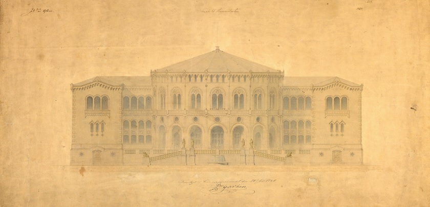 Stortingsbygningens fasade mot Akersgata. Fasadetegning av Emil V. Langlet, 1860. Riksantikvaren. Foto: Stortinget/Teigens fotoatelier.