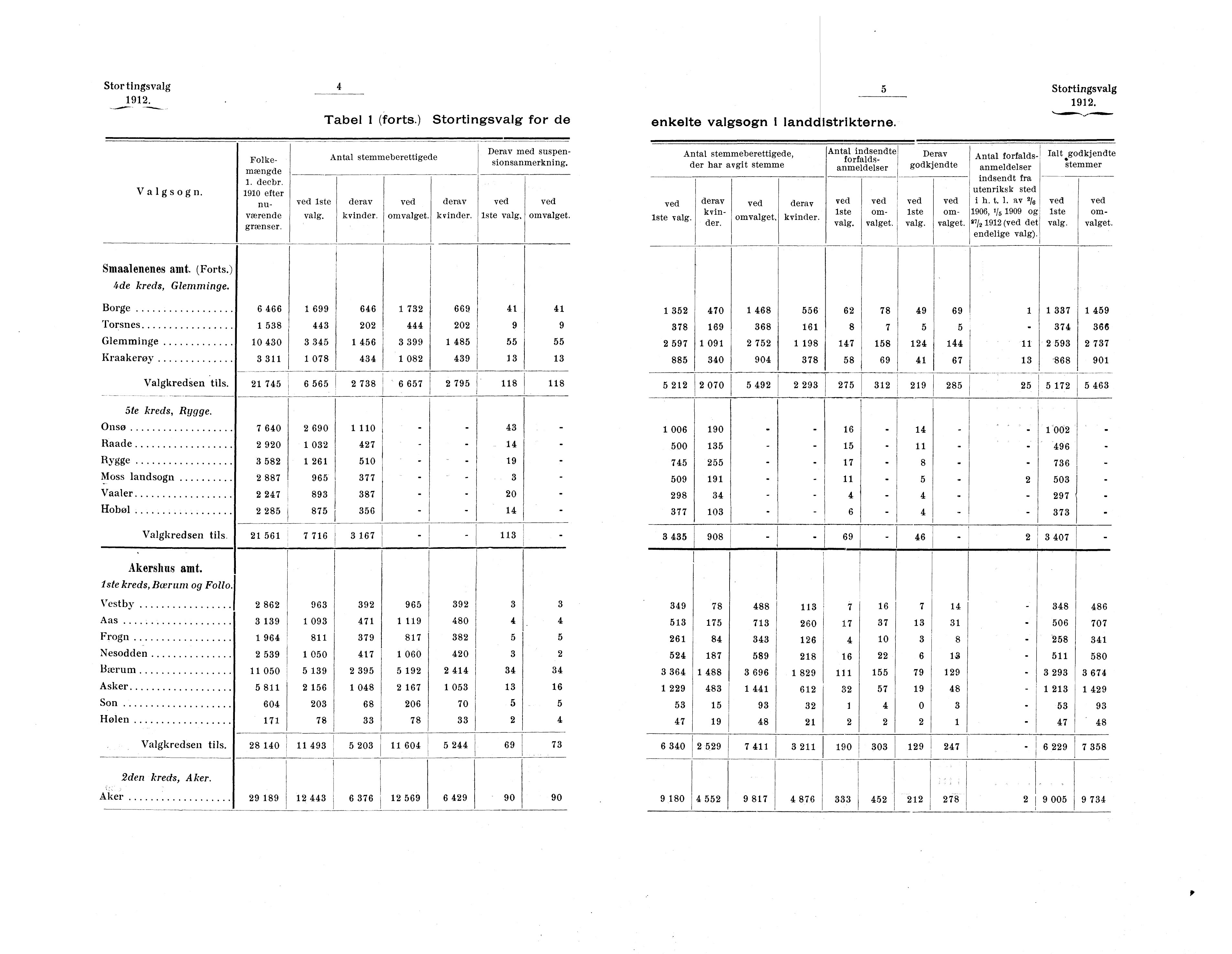 Valgstatistikk fordelt på valgdistrikter i stortingsvalget i 1912.